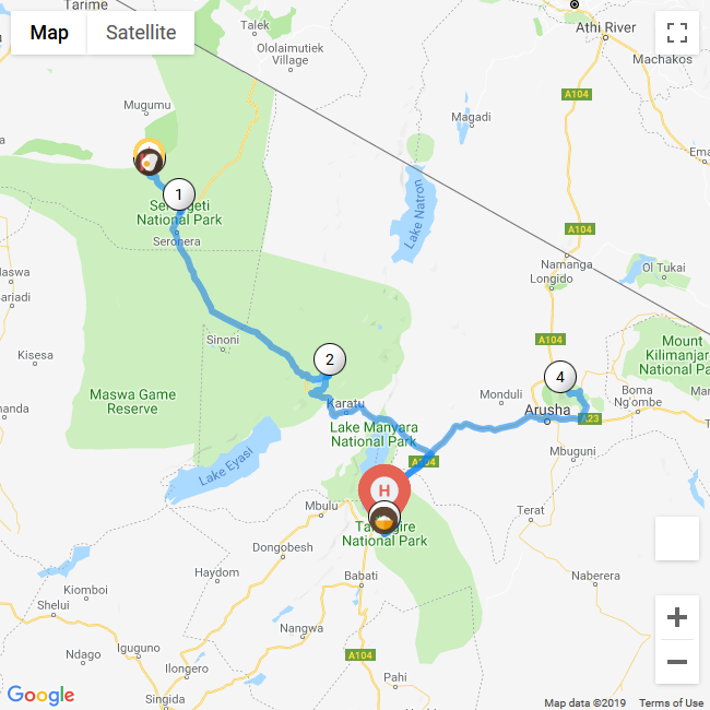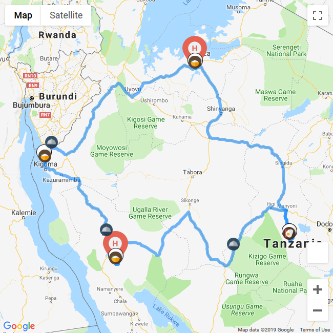 Tanzania Tours 2 Views Tanzania, TanzaniaRoute R411Tanzania > Lake Victoria > Gombe National Park > Katavi National Park > Tanzania T448 Rest at Lake Victoria | Gombe National Park | Katavi National Park 2434 KmsClick to View1251Kms4Days3Nights1 Views Tanzania,TanzaniaRoute R410Serengeti > Serengeti National Park > Ngorongoro Crater > Tarangire National Park > Arusha National Park T447 Rest at Tarangire National Park 543 KmsClick to View1251Kms2Days1Nights1 Views Tanzania,TanzaniaRoute R412Tanzania > Tarangire National Park > Ngorongoro Conservation Area > Serengeti > Arusha > Tanzania T449 Rest at Tarangire National Park | Serengeti | Arusha 1618 KmsClick to View1251Kms4Days3Nights